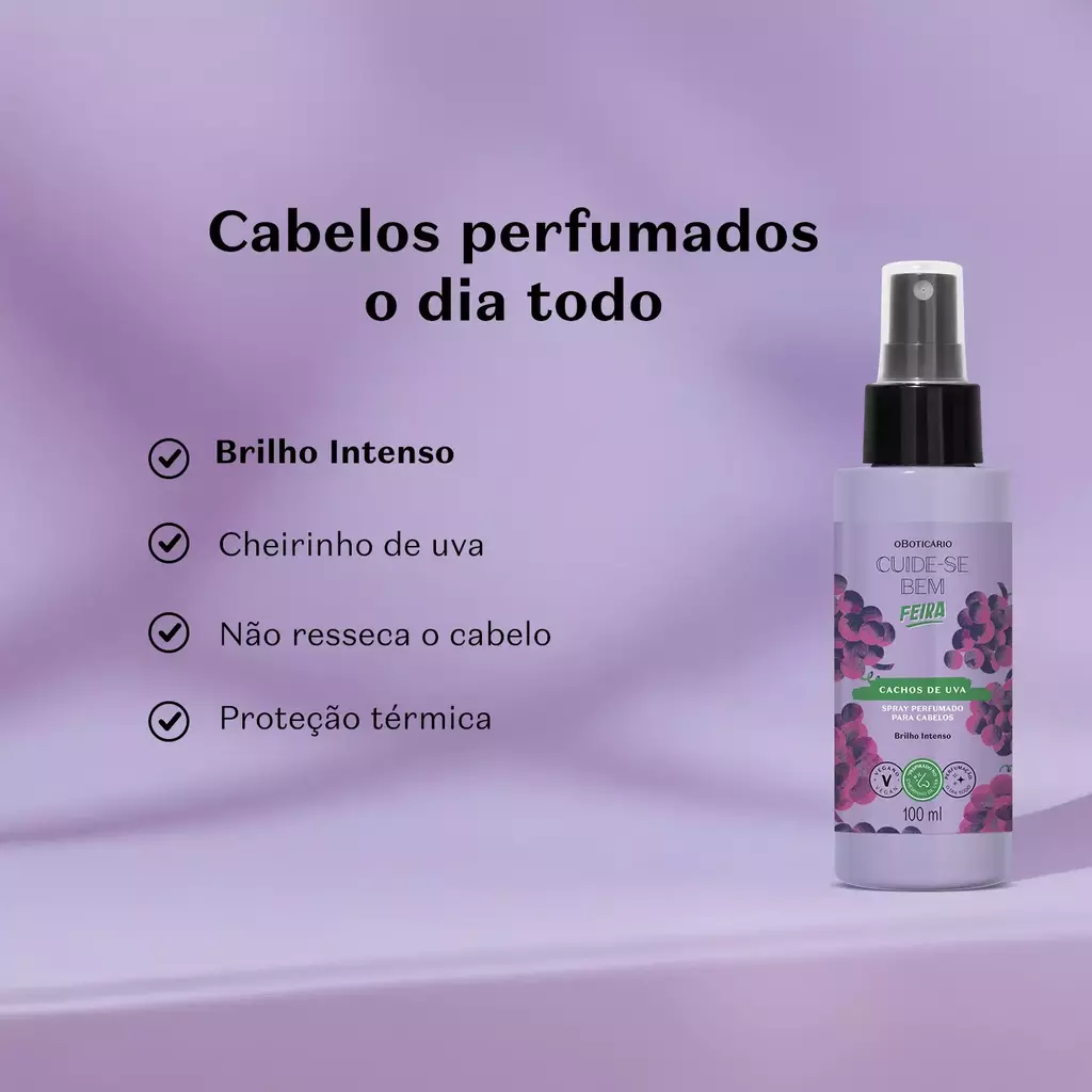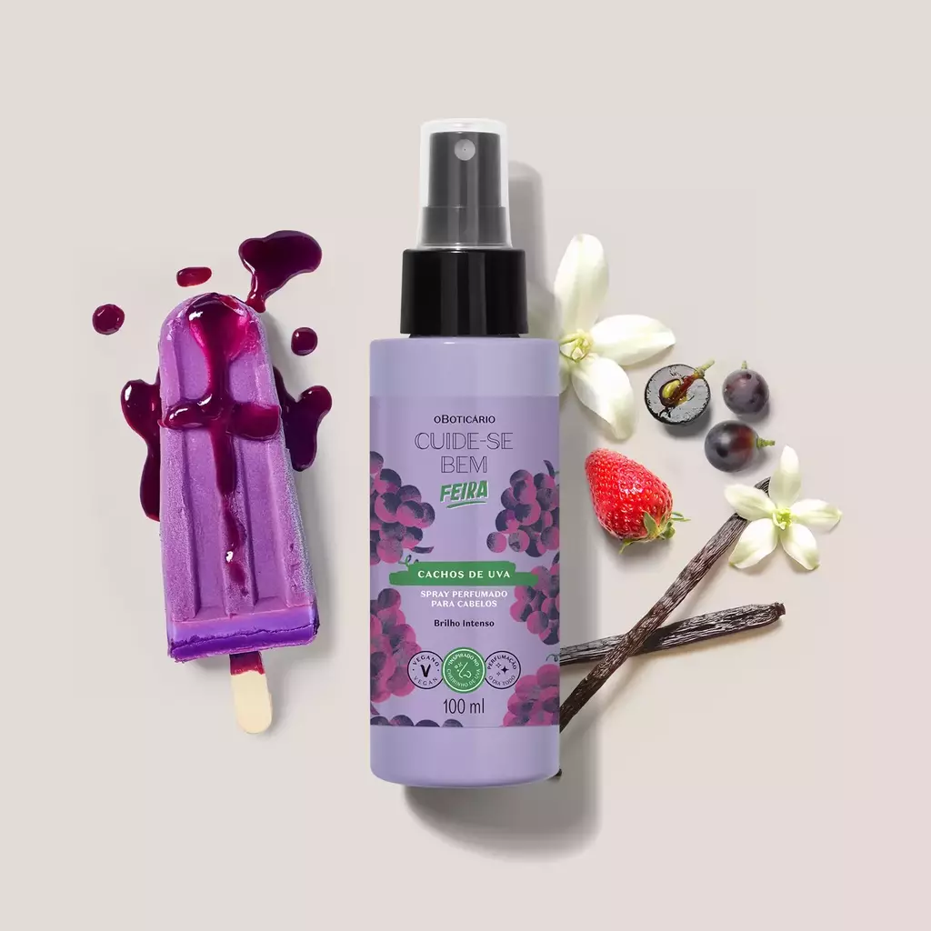 Em edição limitada, o Spray Perfumado Para Cabelos Cuide-se Bem Feira Cachos de Uva vai deixar seu cabelo perfumado com uma fragrância frutal inspirada no cheirinho de Uva.